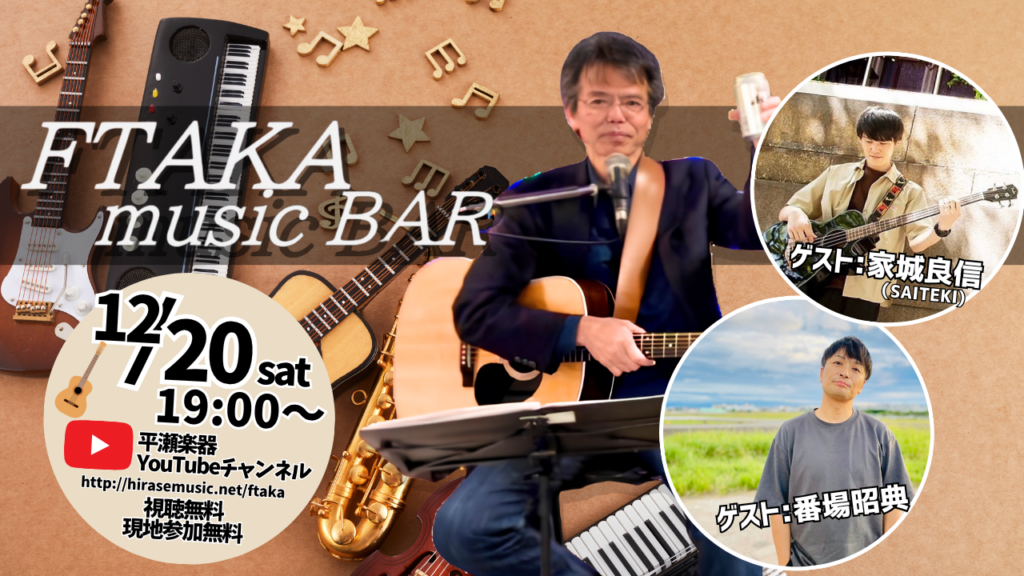 弾き語りミュージシャンとして地域で長く活動をしているFTAKAとFTAKAファミリーによる、音楽とトークたっぷりのまったり配信ライブシリーズです。